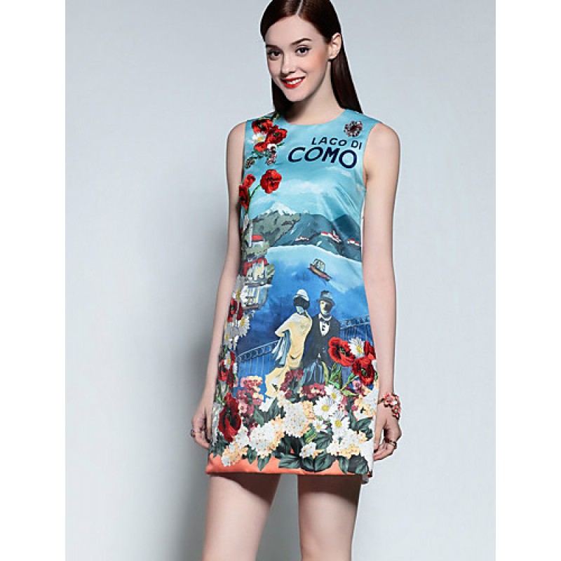 Boutique S Women's Casual/Daily Cute A Line Dress,Print Round Neck Above Knee Sleeveless Blue Cotton Summer