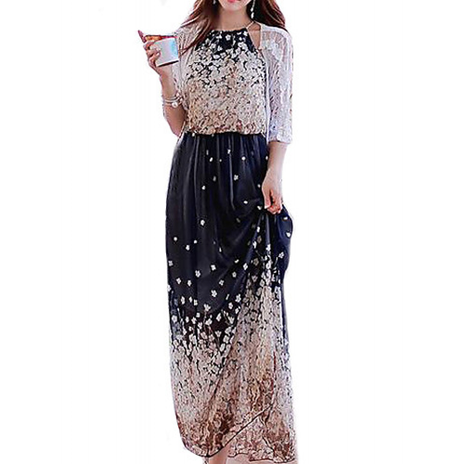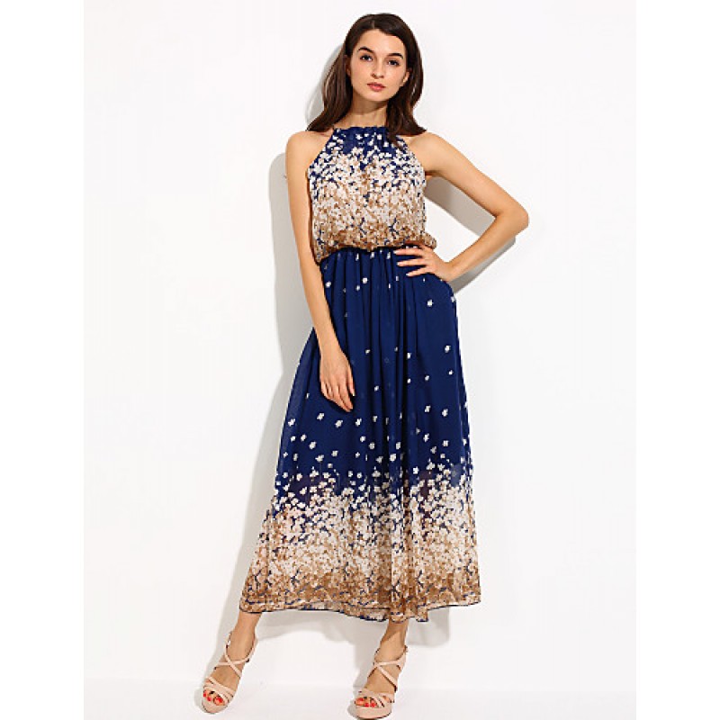 Women's Beach / Holiday Boho Chiffon / Swing Dress,Floral Halter Maxi Sleeveless Blue Polyester Spring / Summer Mid Rise Micro-elastic