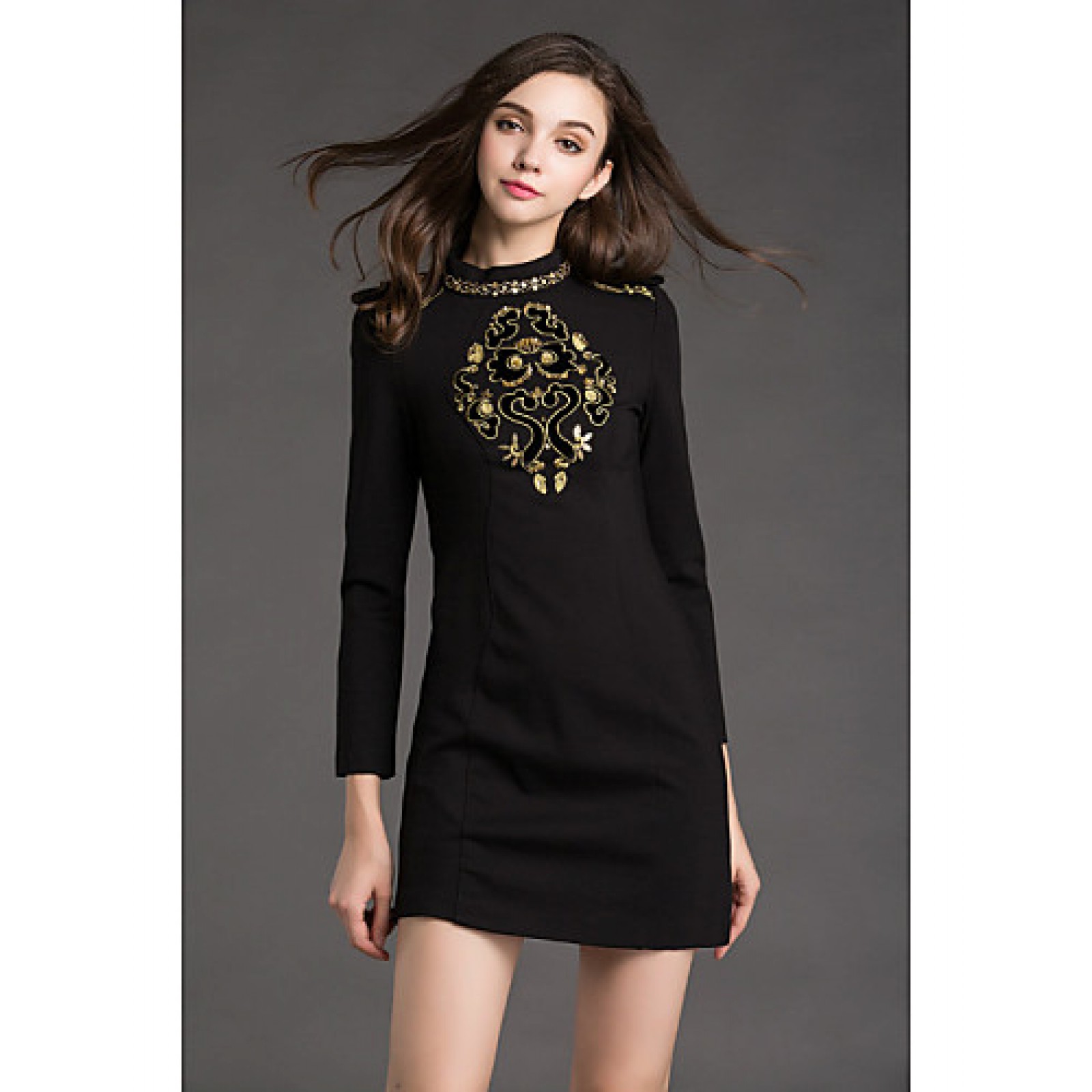 Women's Work Shift Dress,Jacquard Crew Neck Mini Long Sleeve Black Cotton / Polyester Spring