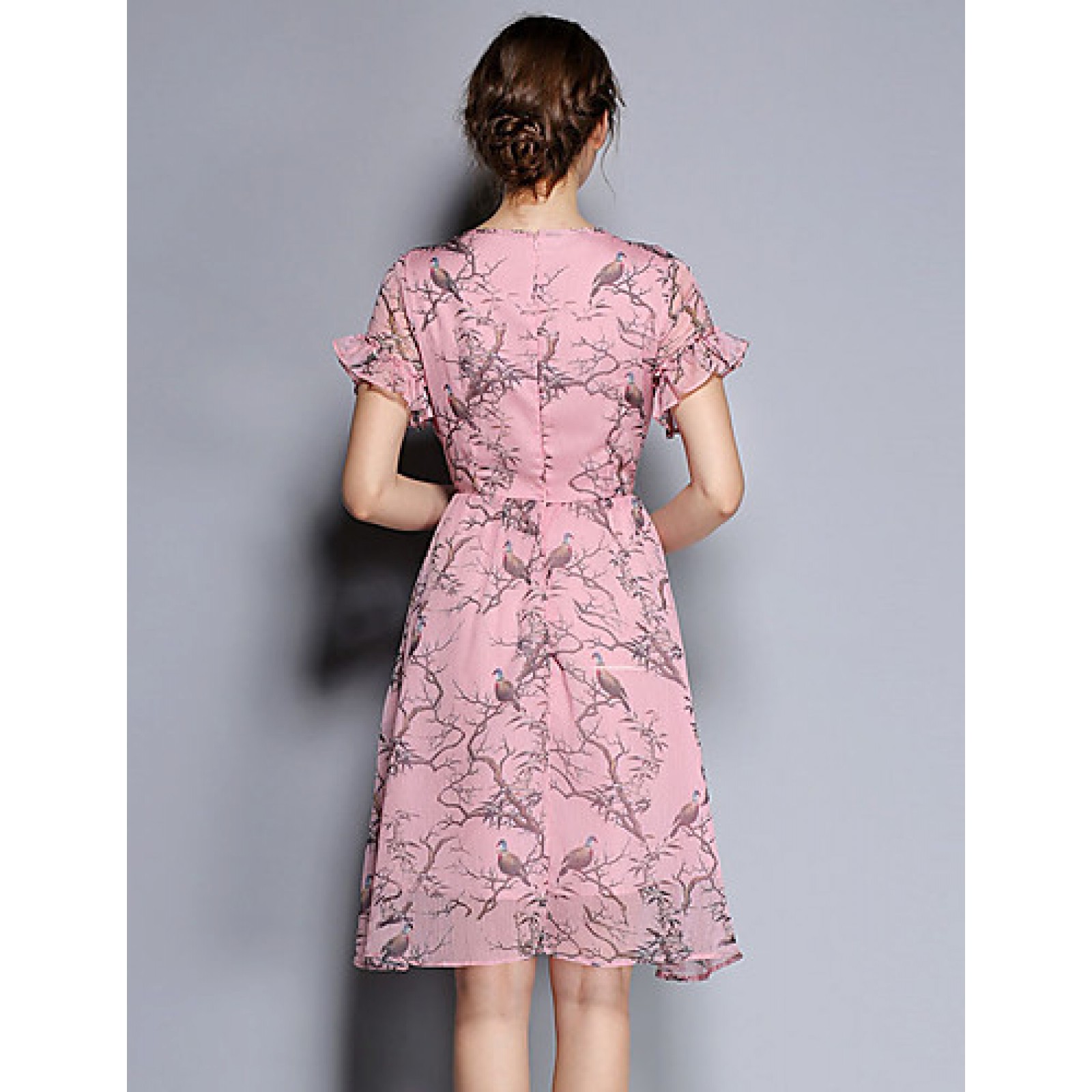 Women's Party/Cocktail Vintage Sheath / Chiffon Dress,Print Round Neck Knee-length Short Sleeve Pink Silk Summer